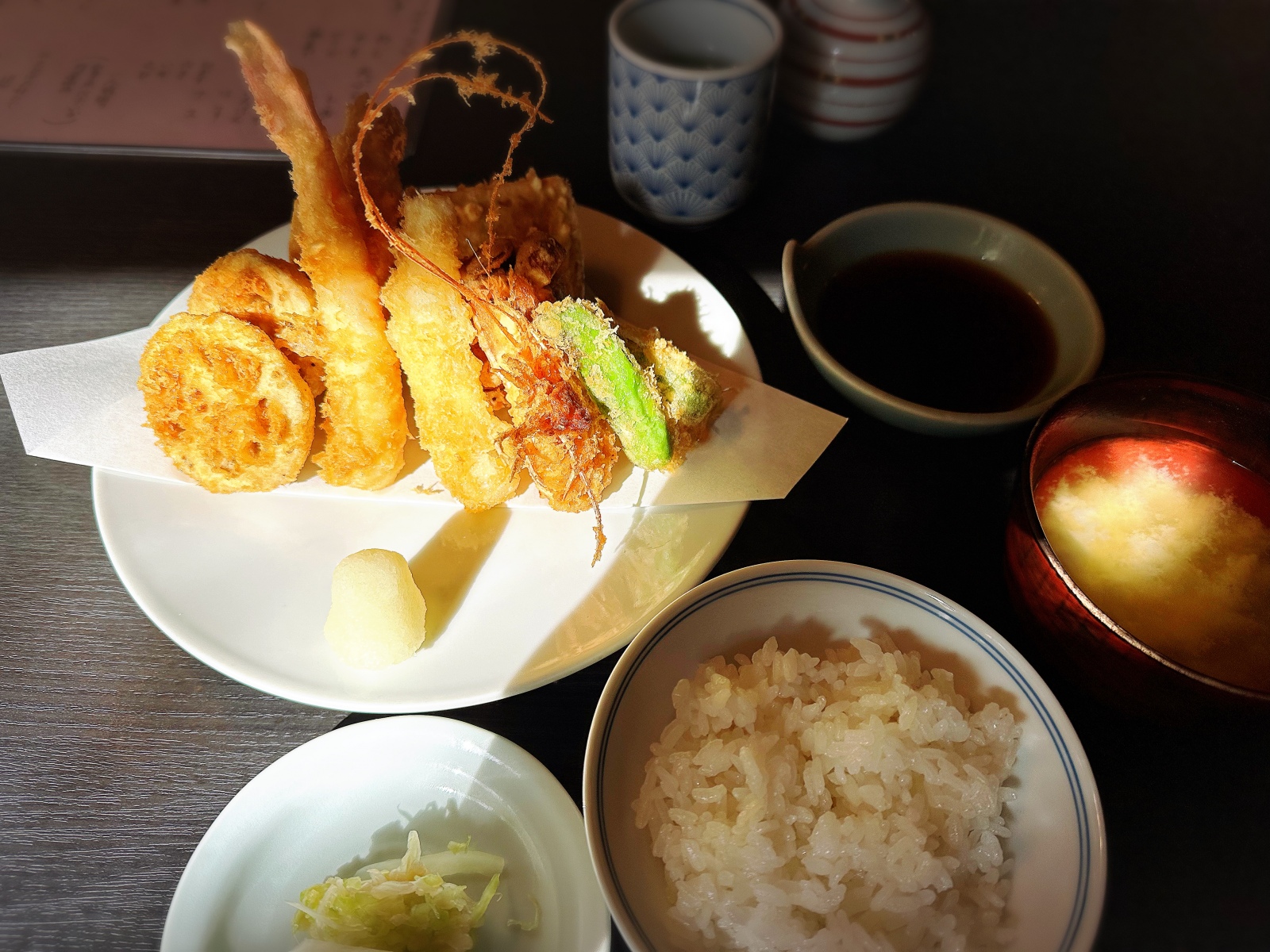 天ぷら定食 老舗の天ぷら屋さんでランチしてきました。お店はTHE昭和な雰囲気で店員さんもとっても良かったです😊けどね〜。天ぷらは揚げすぎで固かったし、お味噌汁はダシが全く効いてなくて不味くて二口でやめたのよ…💧これであのお値段…と思うと次は無いなと思いました。残念でした〜。残念だったので場所と店名は内緒にします❌